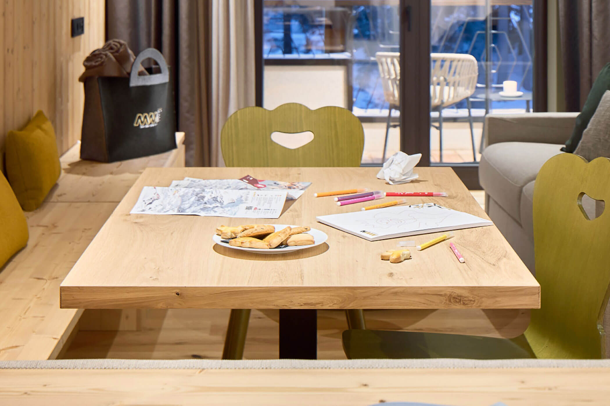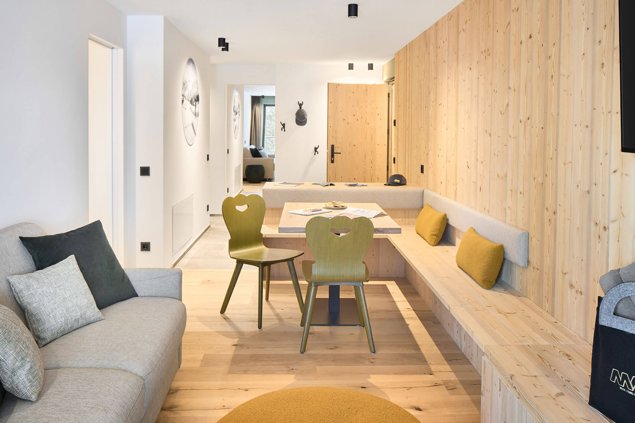 Le ampie finestre dei nostri appartamenti a Corvara creano l’ambiente luminoso e solare, mentre l’amore per i dettagli e gli elementi di design danno vita a un’accogliente atmosfera di benessere. Tutti gli appartamenti del nostro apart-hotel in Alta Badia sono dotati di parquet e mobili pregiati, cucine completamente attrezzate, accessori per bambini e altro ancora.